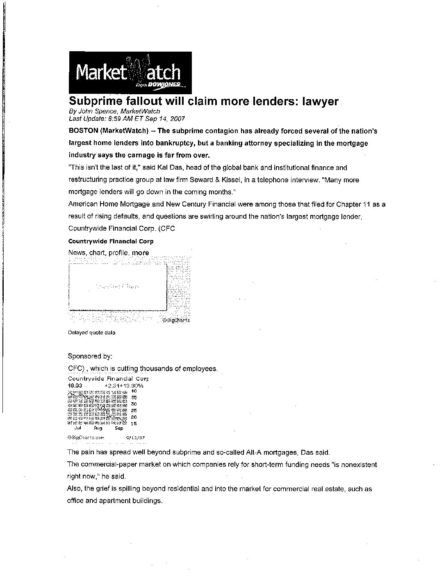 Kal Das is quoted in the MarketWatch article entitled “Subprime Fallout Will Claim More Lenders:Lawyer.” September 14, 2007 MarketWatch Subprime Fallout Will Claim More Lenders:Lawyer Related Practices Global Banking and Corporate Trust Group