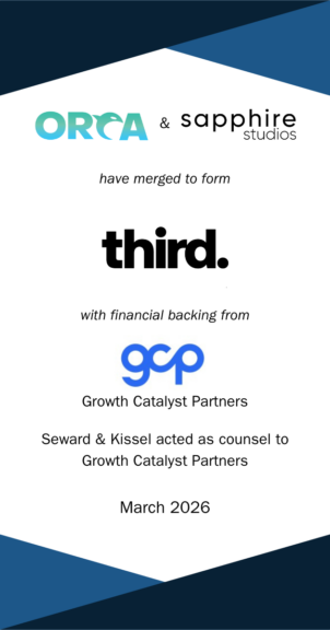 On March 26, 2026, social commerce agencies Orca and Sapphire Studios announced that they had merged to form a new entity called Third. The deal was completed with financial backing from private equity firm Growth Catalyst Partners. Seward & Kissel is pleased to have represented Growth Catalyst Partners in connection with this middle market private equity transaction.